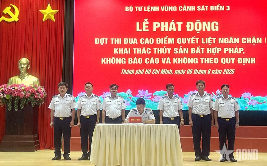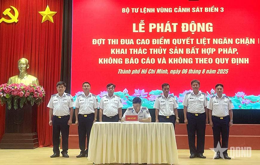 Sáng 6-8, Bộ tư lệnh Vùng Cảnh sát biển 3 tổ chức phát động đợt thi đua cao điểm với chủ đề: “Nêu cao tinh thần trách nhiệm, đoàn kết, hiệp đồng, kiên quyết đấu tranh chống khai thác hải sản bất hợp pháp, không báo cáo và không theo quy định (IUU)”. Đại tá Cao Xuân Quận, Phó chính ủy Vùng Cảnh sát biển 3 chủ trì lễ phát động.