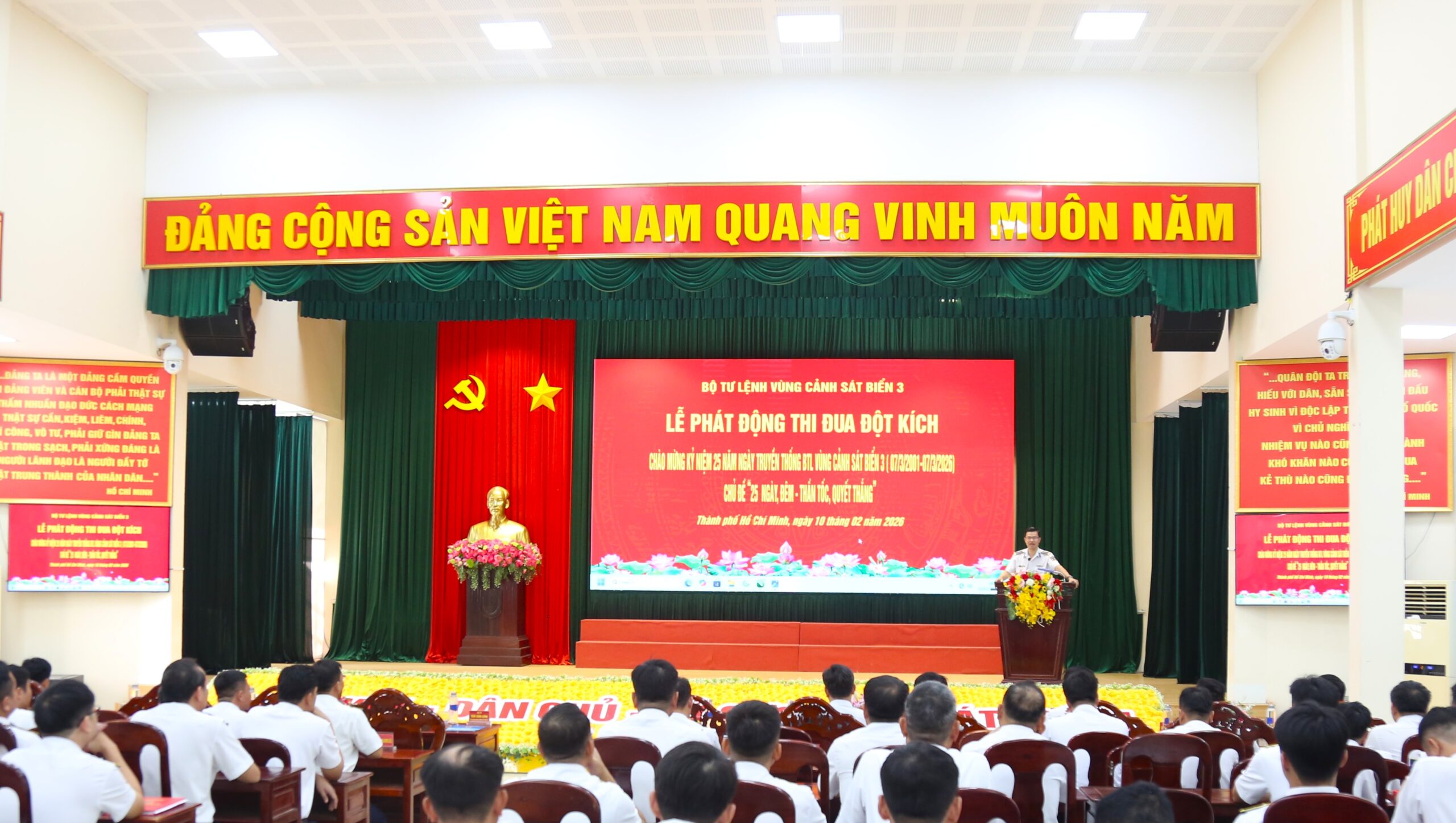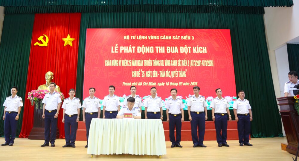 Ngày 10/2, Đảng ủy, Hội đồng Thi đua – Khen thưởng Bộ Tư lệnh Vùng Cảnh sát biển 3 tổ chức Lễ phát động Đợt thi đua đột kích chào mừng, kỷ niệm 25 năm ngày Truyền thống Bộ Tư lệnh Vùng Cảnh sát biển 3 (07/3/2001-07/3/2026) với chủ đề “25 ngày, đêm – Thần tốc, quyết thắng”.